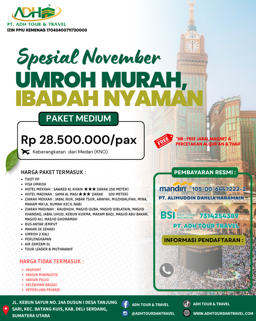 PT. ADH Tour & Travel Juga Menyediakan Layanan Umroh dan Haji di Antara Nya :